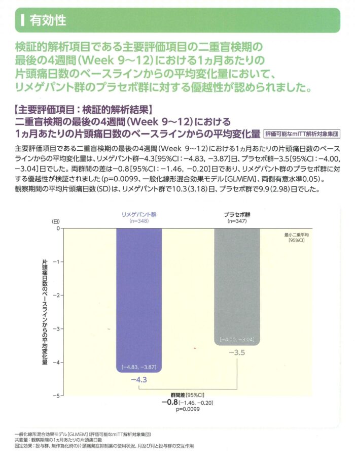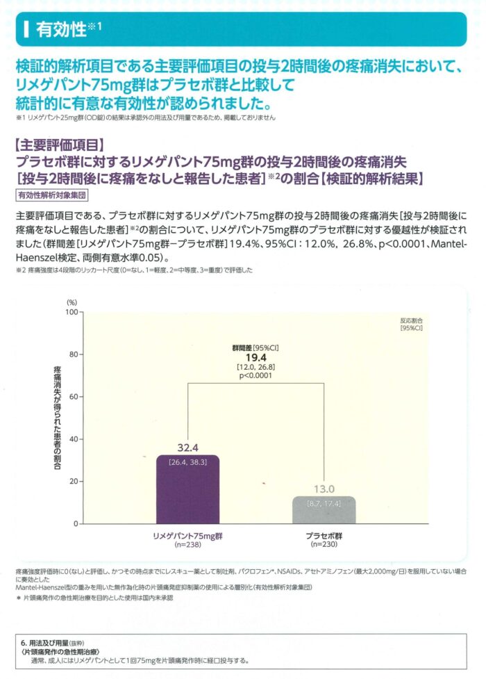 片頭痛の原因となるCGRP受容体に拮抗して効果を示します。従来のCGRP注射薬と違って発作薬としても効果があるとの結果です。