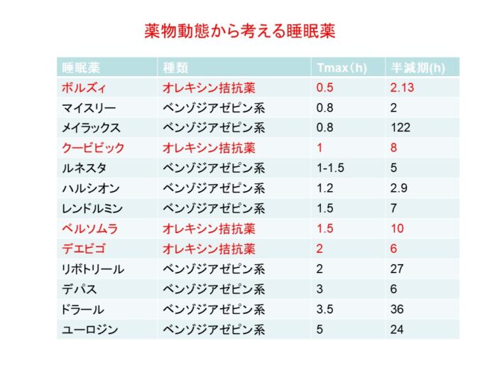そんな中、ボルズィはTmaxが一番短いです。そのため、入眠障害に有効と考えられ、実際に効果を得ている話をしました。