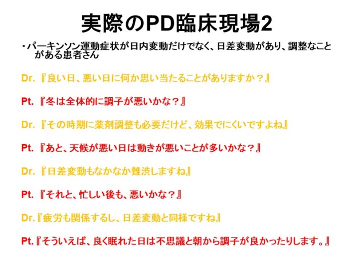 今回は、日内変動に対して非運動症状を含めた夜間症状が問題になることを話しました。聴衆が100人を超えてたそうで、ビックリしました。3月10日昼にも同じような話をします。