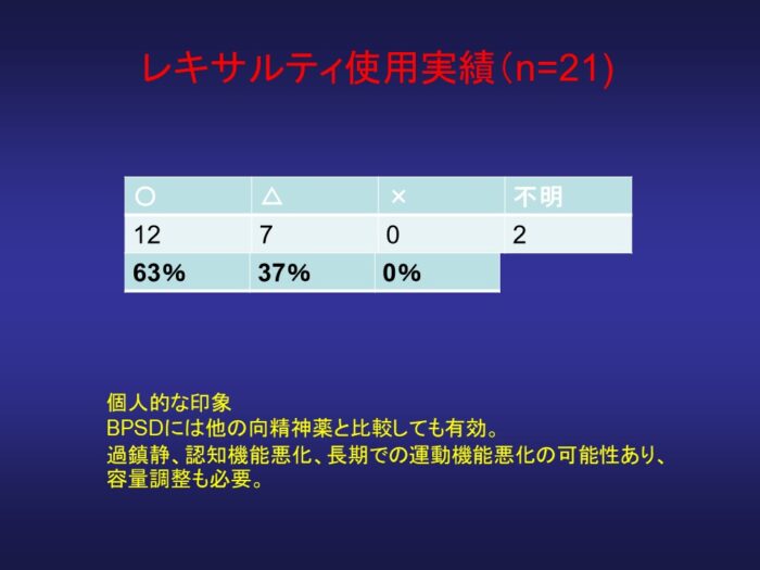 これを利用して、早期発見、早期治療につながればと思っています。もう一つがBPSDへの対応です。保険適応のあるレキサルティは有効ですが、いわゆる効きすぎがあるようにも実感したので、患者さんの状況に応じて微調整が必要かとも考えます。