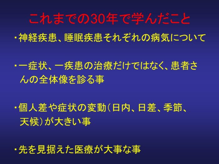 来年度でデビュー30周年になります。ということで、30年振り返りながら、今後の認知症診療を話させていただきました。パーキンソン病とレム睡眠行動障害等の種々の研究、診療よりいろいろと学んだことを説明です。