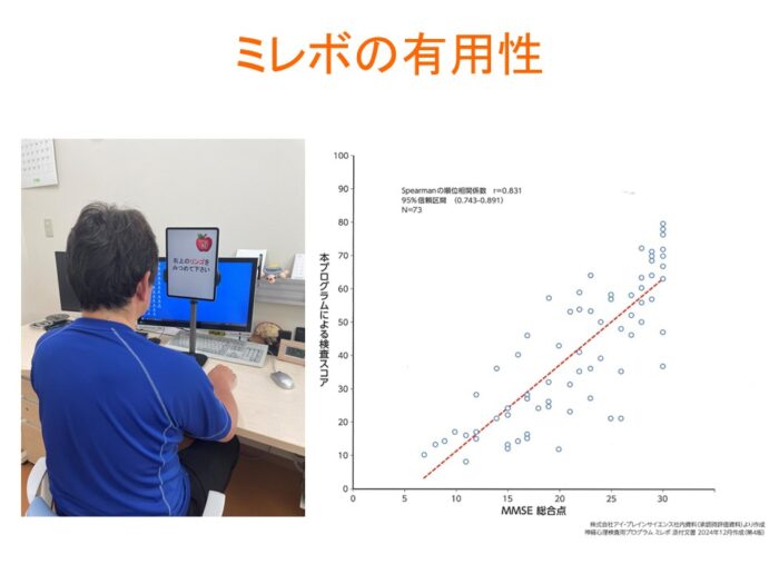 ゲーム感覚で行えて、MMSEとの相関も確立しています。認知機能が気になる方や、注意の必要な病気の方のスクリーニングに使用できるかと考えています。